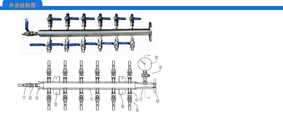 氣源分配器由進口、主罐和多個均勻布置在所述主罐上的輸出口組成,所述輸出口包括輸出嘴和控制閥,輸出口連接供氣儀表或其他裝置。氣源分配器的有益效果是集中供氣操作更加方便,連接方式多樣,材料可選,供氣點數可變,使用壓力高;具有結構簡單,維修方便,加工成本低、效率高,壓力損失小等優點。