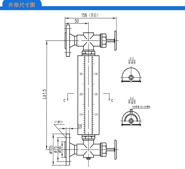儀表上下閥都裝有PN1.6MPa,DN20的法蘭。通過焊接在容器上的法蘭,與容器組成連通器,透過玻璃管就可直接顯示容器內介質液位的高度。
