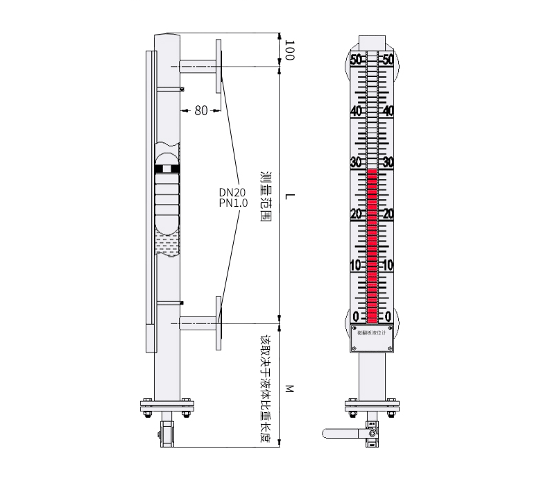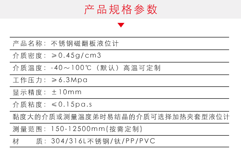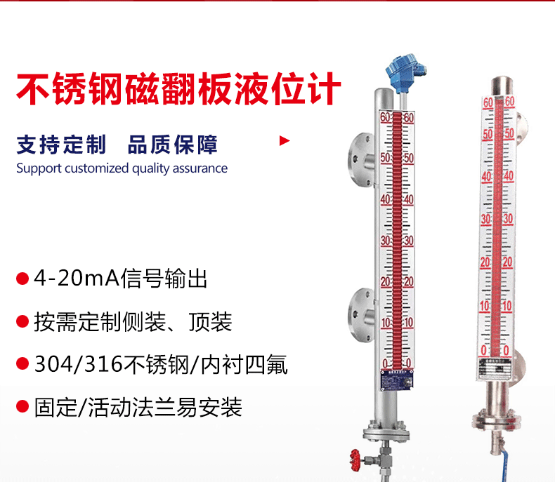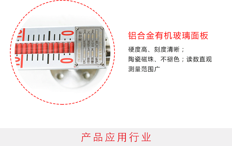 磁翻板液位計儀表可用于各種塔、罐、槽、球型容器和鍋爐等設備的介質液位檢測。該系列的液位計可以做到高密封,防泄漏和適用于高溫、高壓、耐腐蝕的場合。它彌補了玻璃板(管)液位計指示清晰度差、易破裂等缺陷,且全過程測量無盲區,顯示清晰、測量范圍大。磁翻板液位計的零部件材料采用1Cr18Ni9Ti、316L、0Cr18Ni9Ti、1Cr18Ni9Ti襯PTFE(聚四氟乙烯)、PVC、PP等材料及進口元件,具有優秀的可靠性和抗腐蝕性能