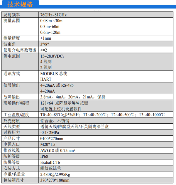 位計采用了76-81GHz的調頻連續波,產品zui大量程可以達到120m盲區可以做到8cm。zui窄3°天線波束角,安裝環境中的干擾對儀表的影響更小,安裝更為便捷。波長更短,在固體表面具有更好的反射特性,因而不需要特別的使用萬向法蘭來進行瞄準。